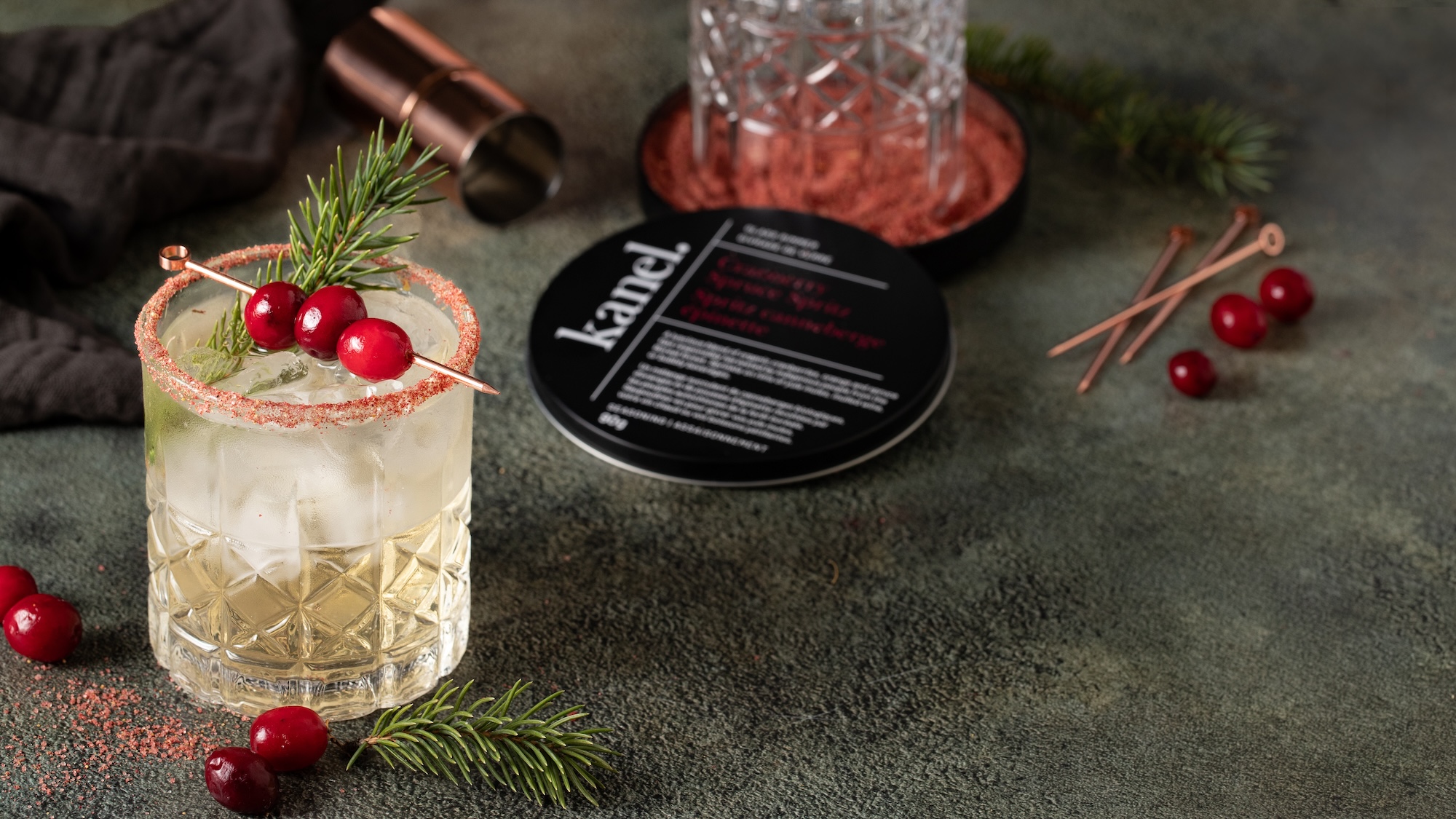 - Enduire le bord d'un verre de sirop simple, puis le rouler dans notre Spritz canneberge épinette.