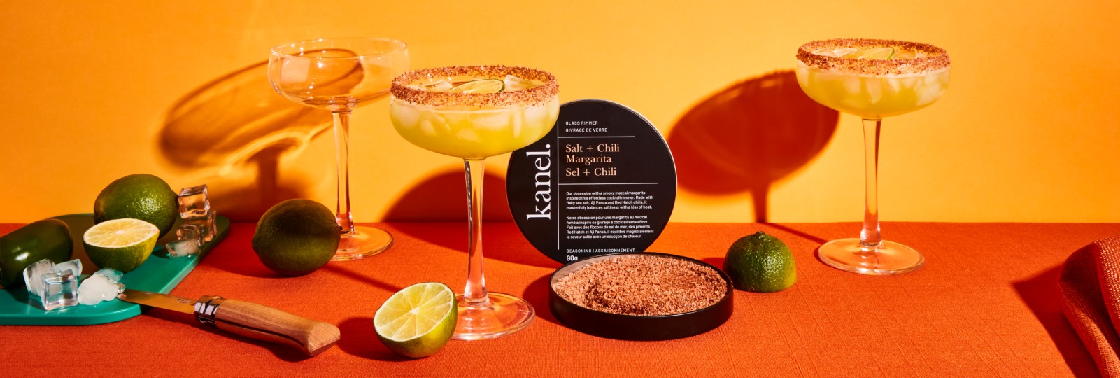 - Humidifier le bord de deux verres à margarita réfrigérés avec un quartier de lime et tremper-les dans notre Givrage Sel + Chili. Remplir de glace et mettre de côté.
